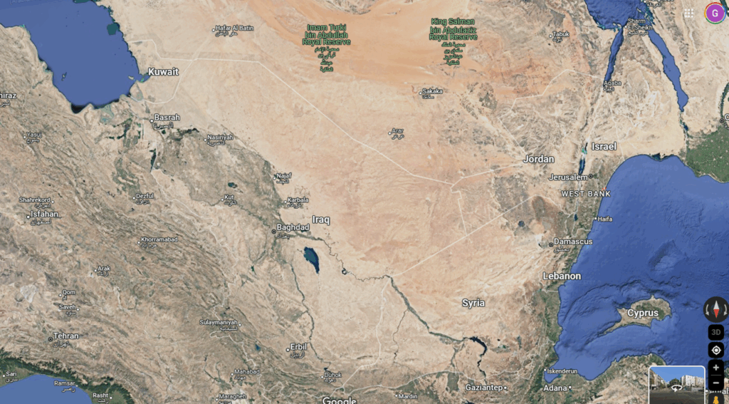 View map from north side to south side. Iran is at east side and Israel is at west side.
