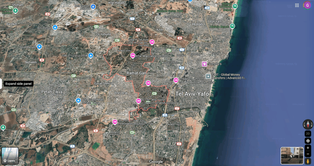 View map from north side to south side. Ramat Gan is a city in the Tel Aviv District of Israel, located east of the municipality of Tel Aviv, and is part of the Gush Dan metropolitan area. It is home to a Diamond Exchange District (one of the world’s major diamond exchanges), Sheba Medical Center (the largest hospital in Israel) and many high-tech industries.