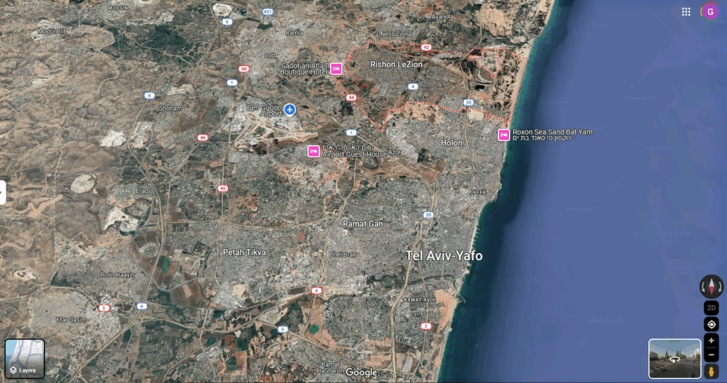 View map from north side to south side. Ben Gurion airport is far off the capital, at southeast of Tel Aviv.