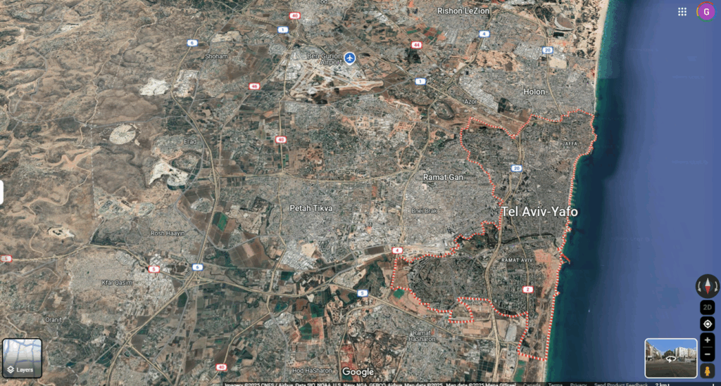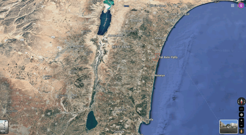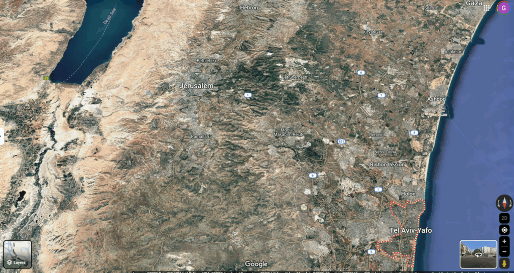 View map from north side to south side. Jerusalem is at southeast side of Tel Aviv.
