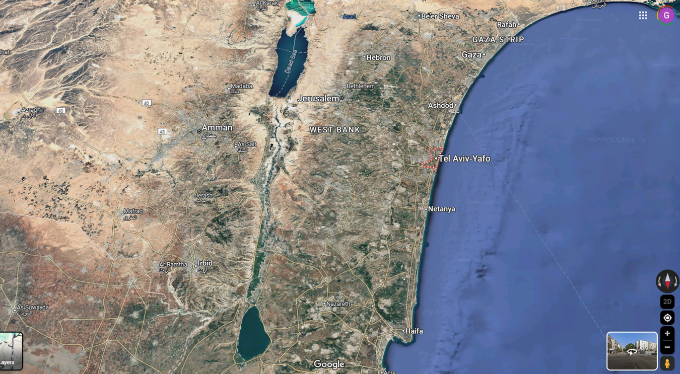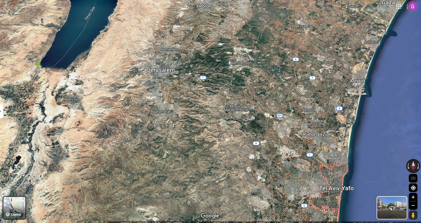 View map from north side to south side. Jerusalem is at southeast side of Tel Aviv.
